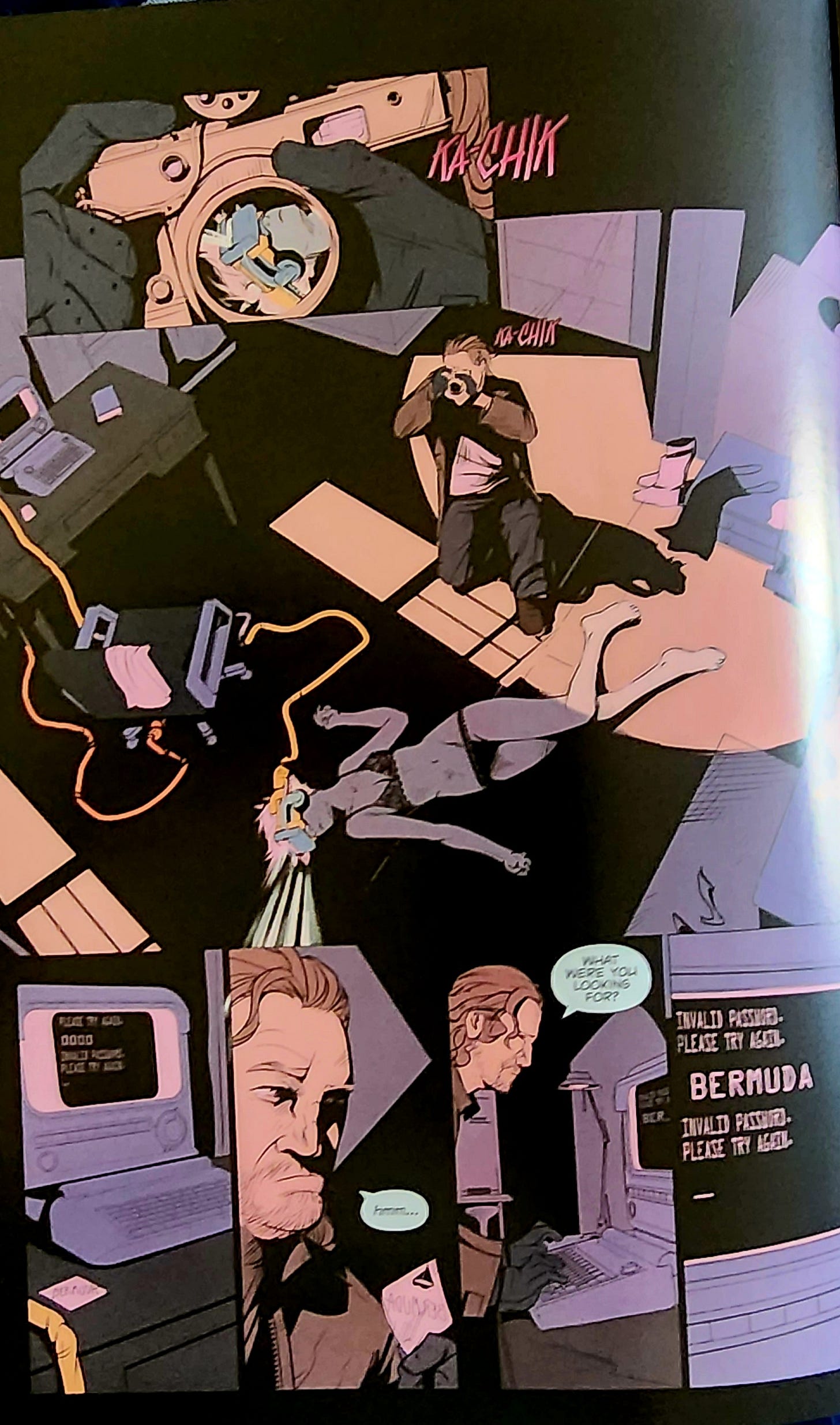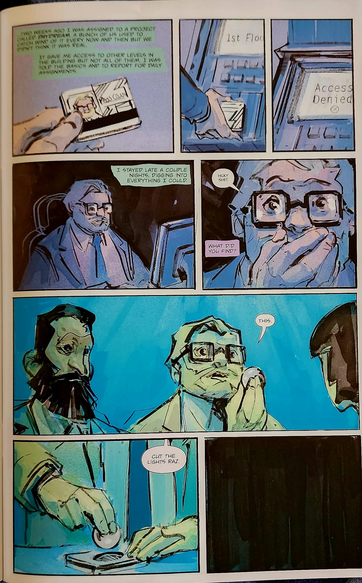 Inside this dome, our hero/protagonist, Gordo, gets an alert on a police scanner about a homicide and quickly arrives on the scene before the authorities to snap some pictures of a dead girl wearing a VR headset (the girl on the first issue cover above). He sells these pics to his journalist friend, but something about the case sticks with Gordo, and he soon finds himself digging deeper than he should.