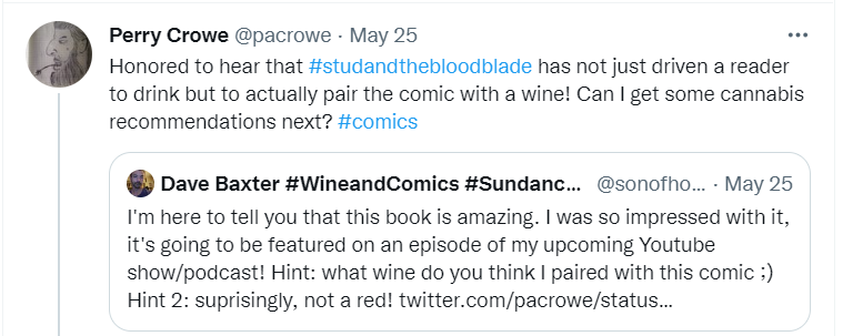 I replied to Perry, saying this was an amazing idea, and my fiance would totally be up for it! One variant of cannabis per issue of STUD. We even recorded all three readings, and they were wonderful (she quite liked the book, and she doesn’t read comics!) But…well…those videos are no longer useable, for…the guessable reasons when it comes to relationships. I’m still on the lookout for the right person to film anew with. I’ve already read the books, and Dallas isn’t much of a cannabis person. Maybe one day! I haven’t given up the dream, Perry!