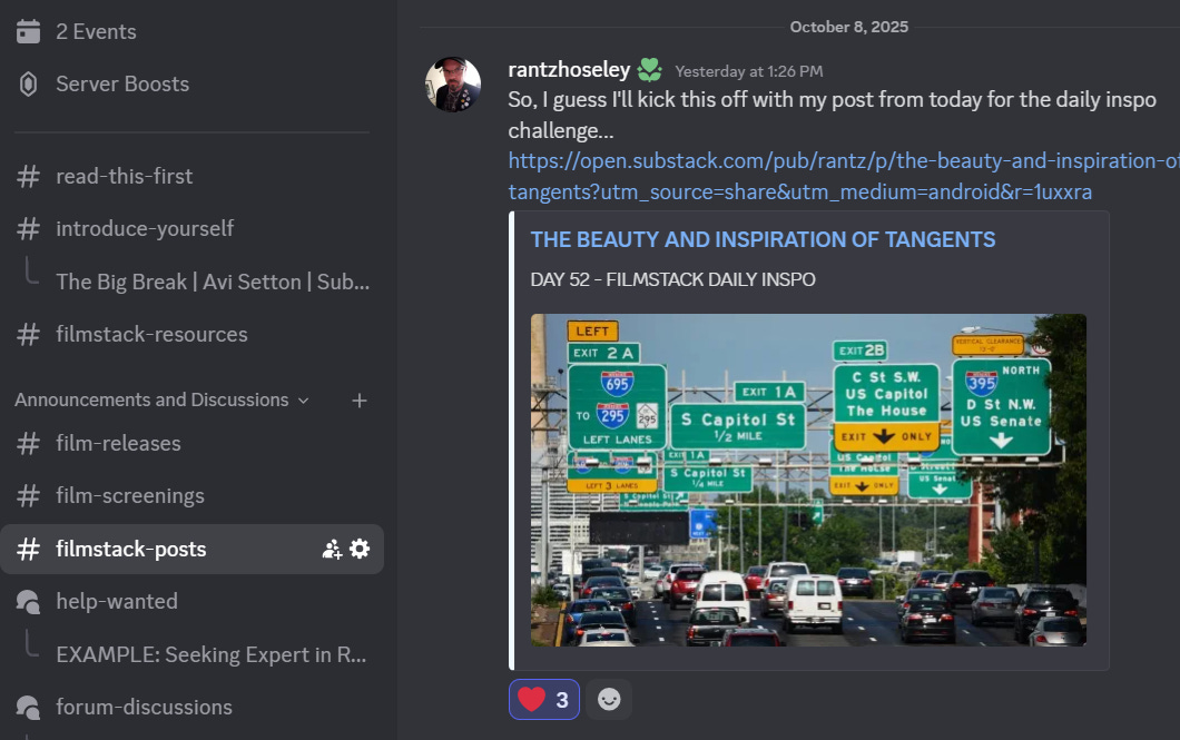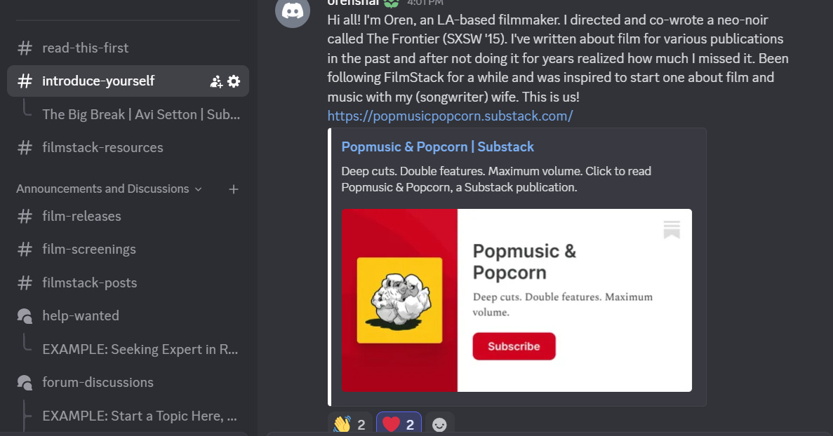 When you first join, make sure to go to the “INTRODUCE YOURSELF” channel, and post your FilmStack Substack!