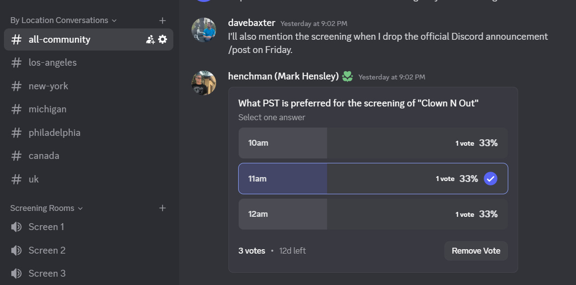 And vote in ’s poll in the ALL COMMUNITY channel. Mark is setting up the Discord’s first digital screening event for his upccoming film - and Mark is based in Greece so this is the joy of Discord and online screenings!