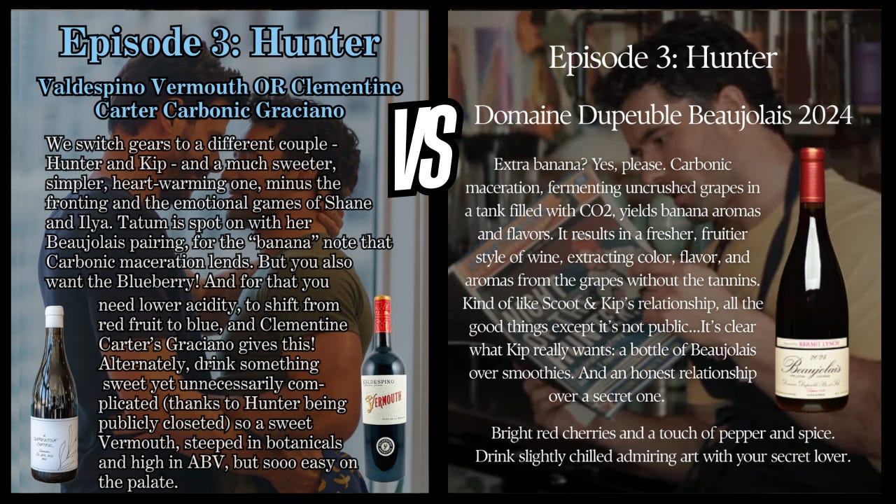 And then you can come back here and vote on this Heated wine pairing Rivalry between myself and Tatum! Below, we respectively select our best pairing for each episode, give our best argument for each choice, and then YOU, dear reader, get to vote which one you like best, for whatever your reasons. Think of Tatum as Shane (talented but tentative, new to this world) and Vintertainment as Ilya (overly aggressive and constantly fronting, though in truth equally as rookie.)