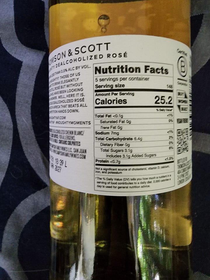 TASTING NOTES: We both gave this wine perfect marks for Flavor/Aroma! Though overall it scorred slightly lower than the Oddbird. This was a truly wonderful de-alc wine, the best tasting of the non-reds, though it’s near complete lack of sugar makes for a notceably thinner body compared to the others. This does not hurt the flavor, and neither of us minded the thinner body, not any more than we would mind a thinner body with a “refreshing”, lighter style of full-alc wine. (And at 25 calories for the whole bottle what can one expect?) Dallas didn’t find the depth/complexity that I did, though he loved the flavor regardless. Citrus, underripe peach, ginger, flintiness, and florals. Absolutely refreshing.