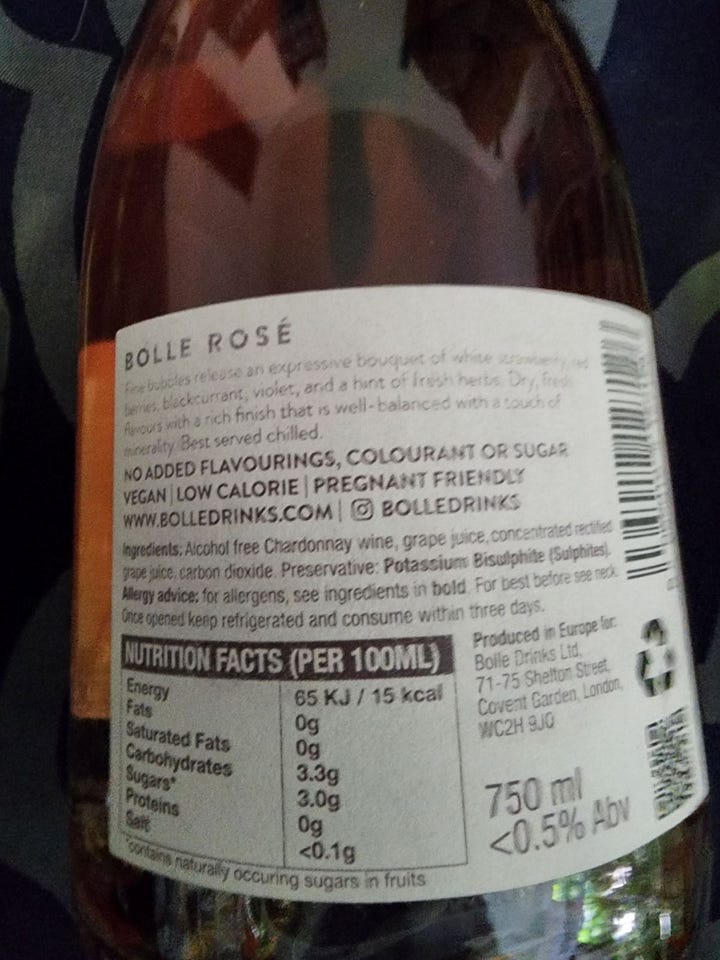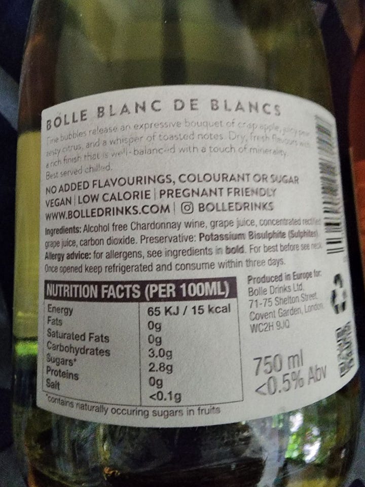 From the winery: BOLLE (“Bubbles” - from “Prendi una bottiglia di bolle”, ”Bring a bottle of bubbles”) consists of Chardonnay wine that is gently de-alcoholised through state of the art vacuum distillation. We then add additional grape juice and yeast, and return to the tank for a secondary fermentation. Once fermented, we add some CO2 to increase the fizz (most is created naturally in the tank) and a little preservative to help prevent oxidisation and bacterial spoilage. Pure wine, no added sugars, flavours, or colours.