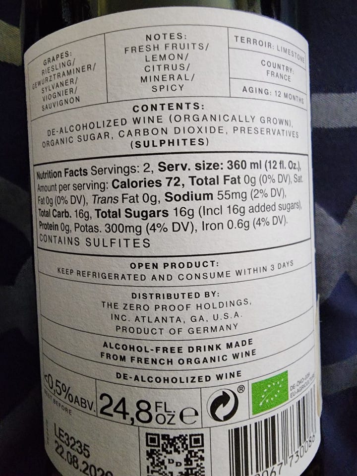80% Dealcoholized Sauvignon Blanc, 14% Dealcoholized White Wine (blend), 6% grape juice