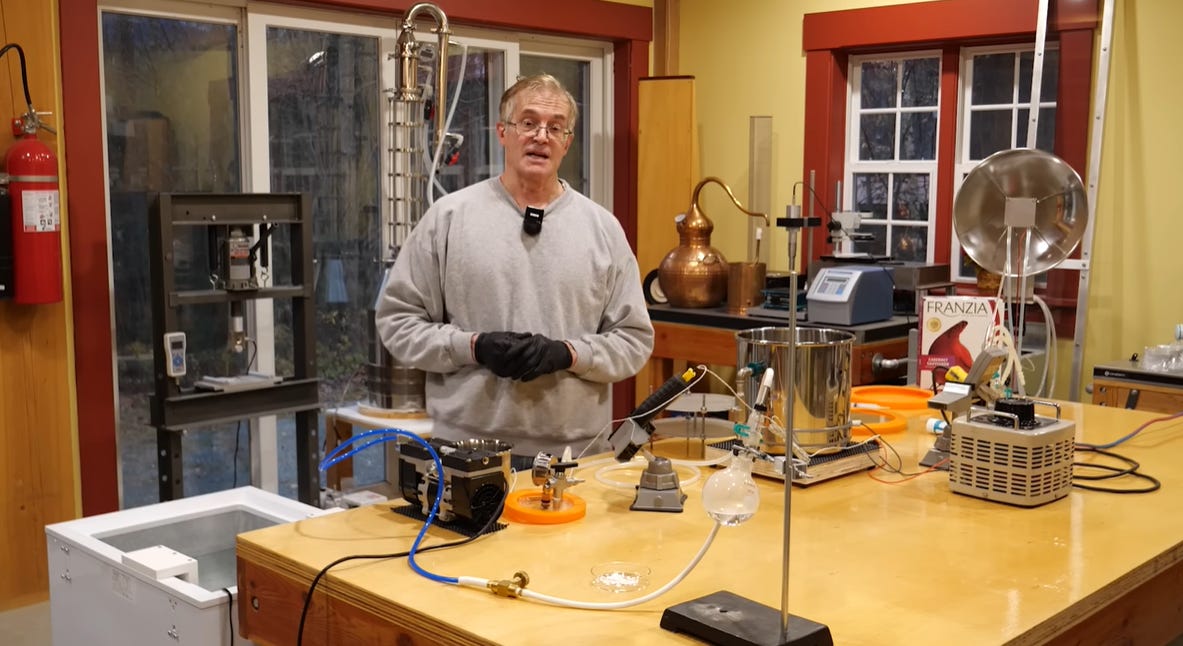 He cobbled together an actual vacuum ditillation set-up with parts you can buy on Amazon! And he walks you through the whole set-up. It’s fascinating, but you likely aren’t interested in that part, so you can skip it below, if you like.